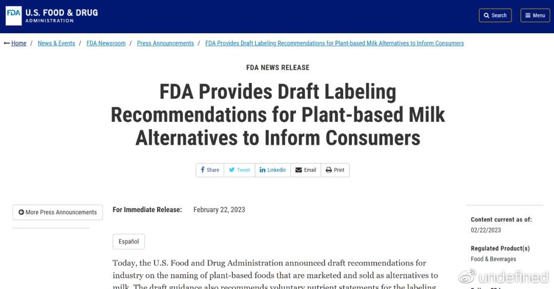 近期,FDA发布标签指南草案,表示植物奶可标记为“奶”,但FDA建议这些饮料在其包装上标明营养成分,以便消费者可将该产品的营养价值与牛奶做比较。 图源:FDA 据SPINS、植物基食品协会...